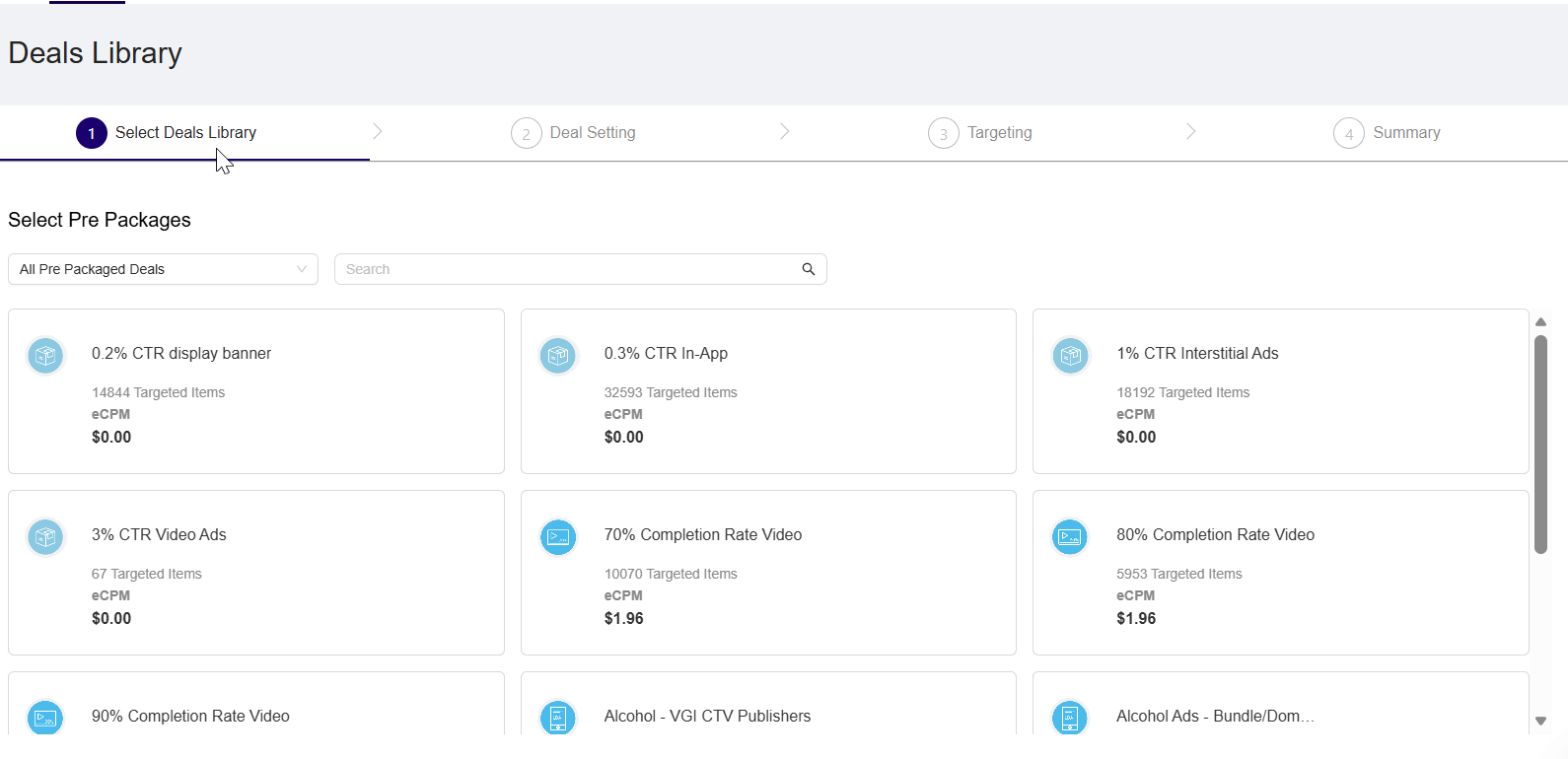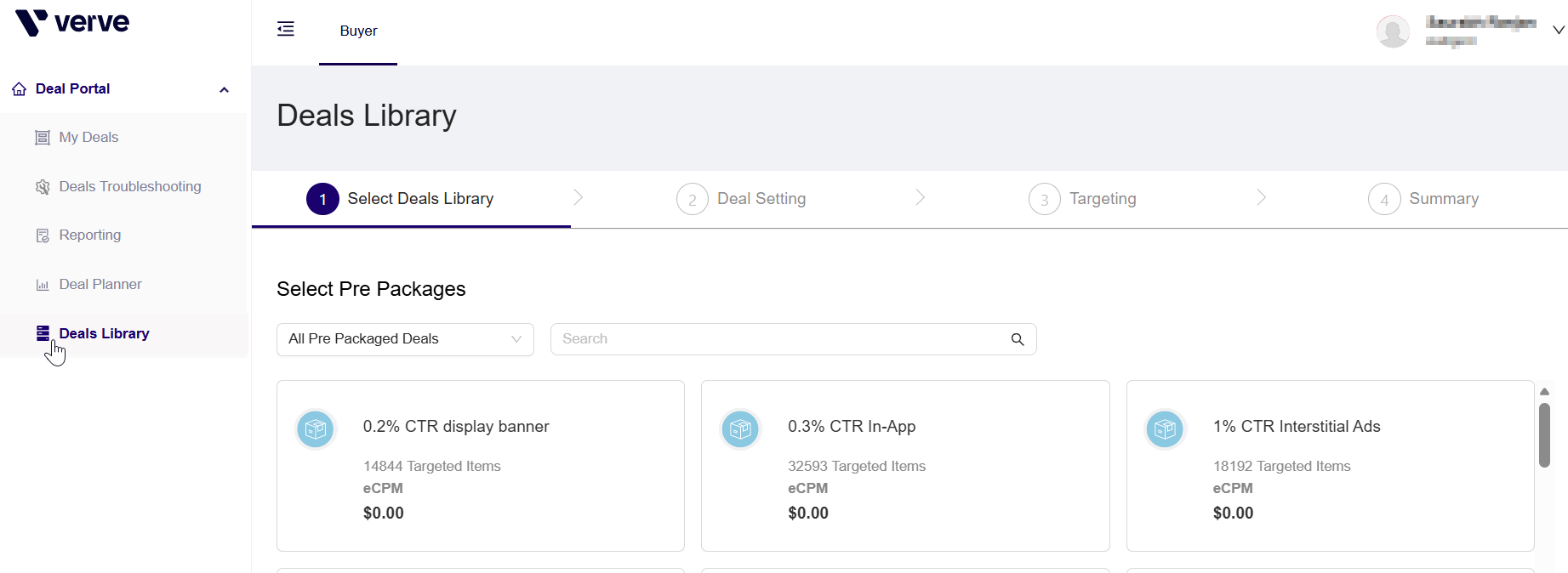 The Verve Deal Portal enables you to create a deal by choosing from the Deal Library. Each pre-defined package is based on a specific theme or season. It includes a default set of targeted items and an eCPM, both of which you can modify later in the setup.